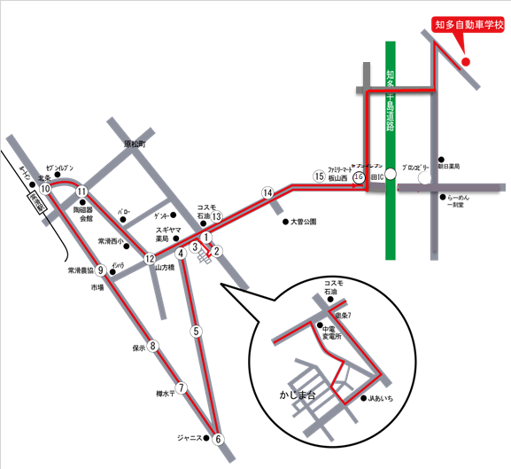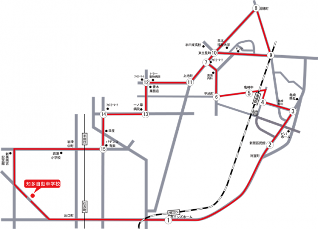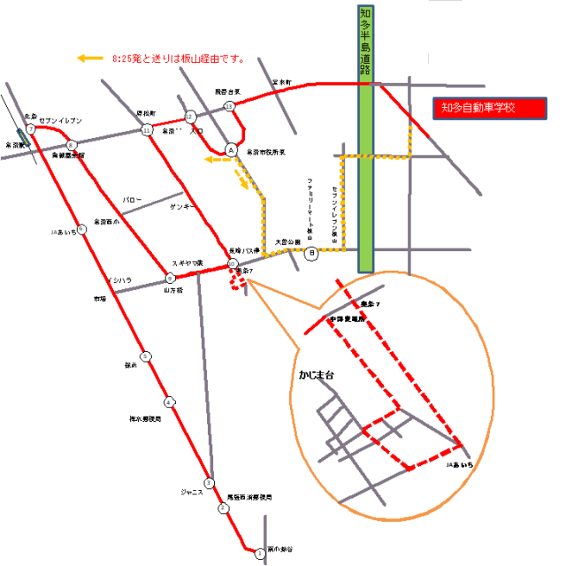 ※ 8:05ちたじ発半田市内方面は、8:30に「ちたしん砂川支店」を左折し、花園方面8:34「武豊平井畑交差点 左折」へとつながります。