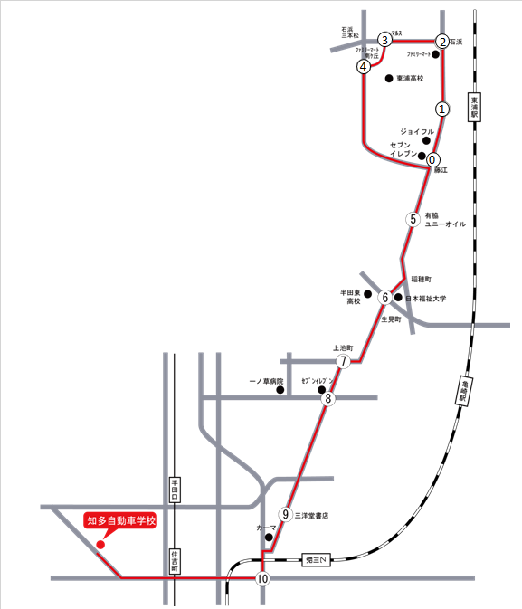 送迎バスマップのように知多半島で、12ルートをご用意しております。また、送迎バスの不便な地域は、最寄の駅より名鉄電車定期券を全額補助致します。
