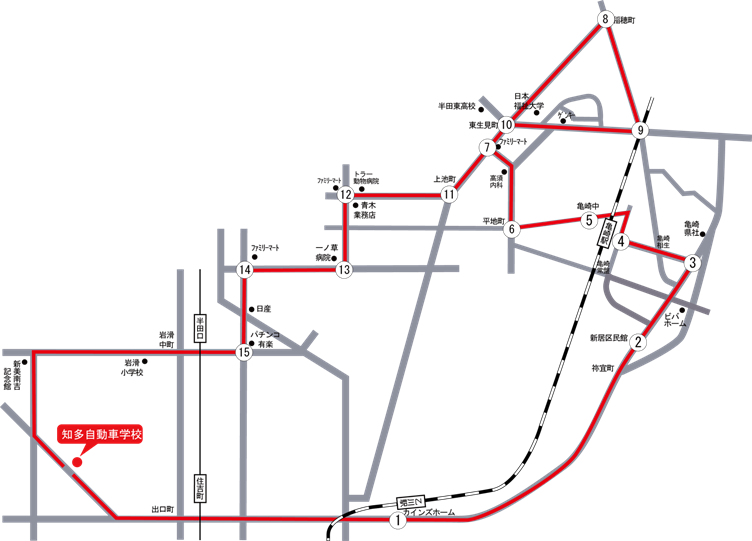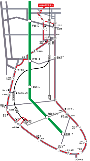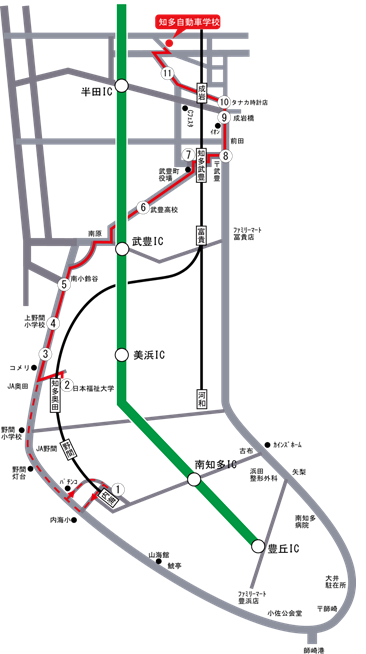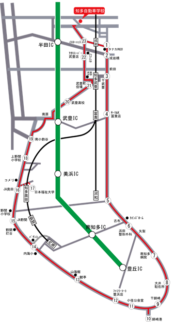 「半田市内方面」「日本福祉大学美浜校方面」「南知多方面」