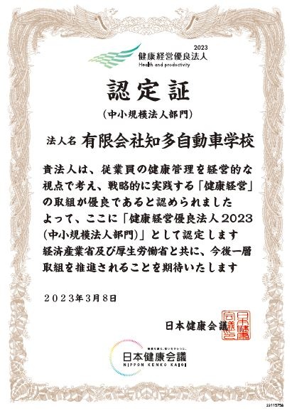 健康、健全な職場を目指して、3月8日に「健康経営優良法人認定証」を取得しました。
